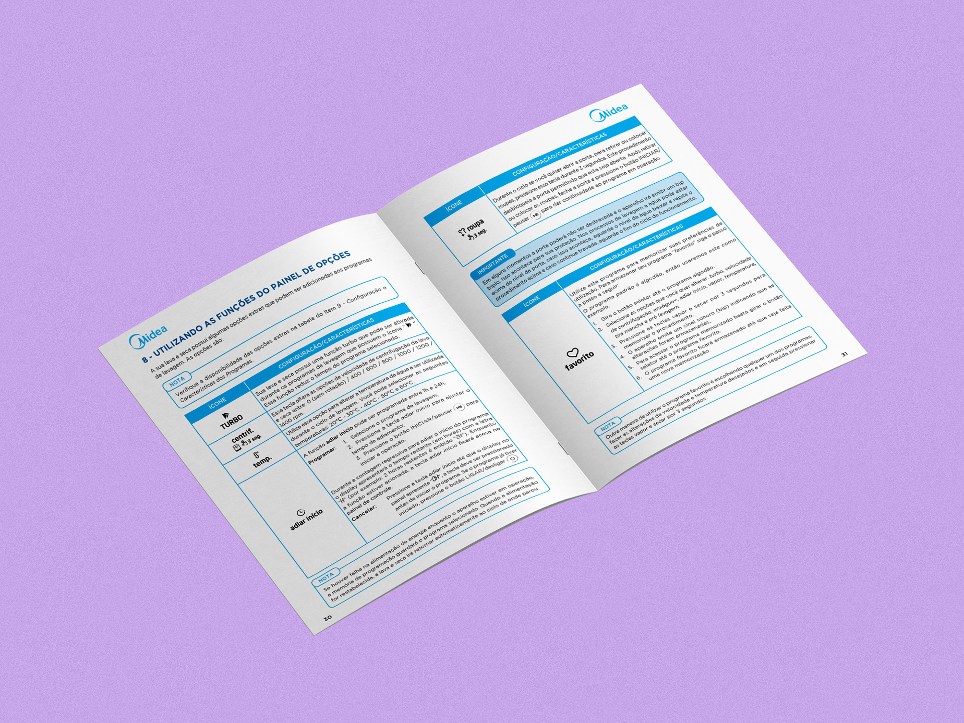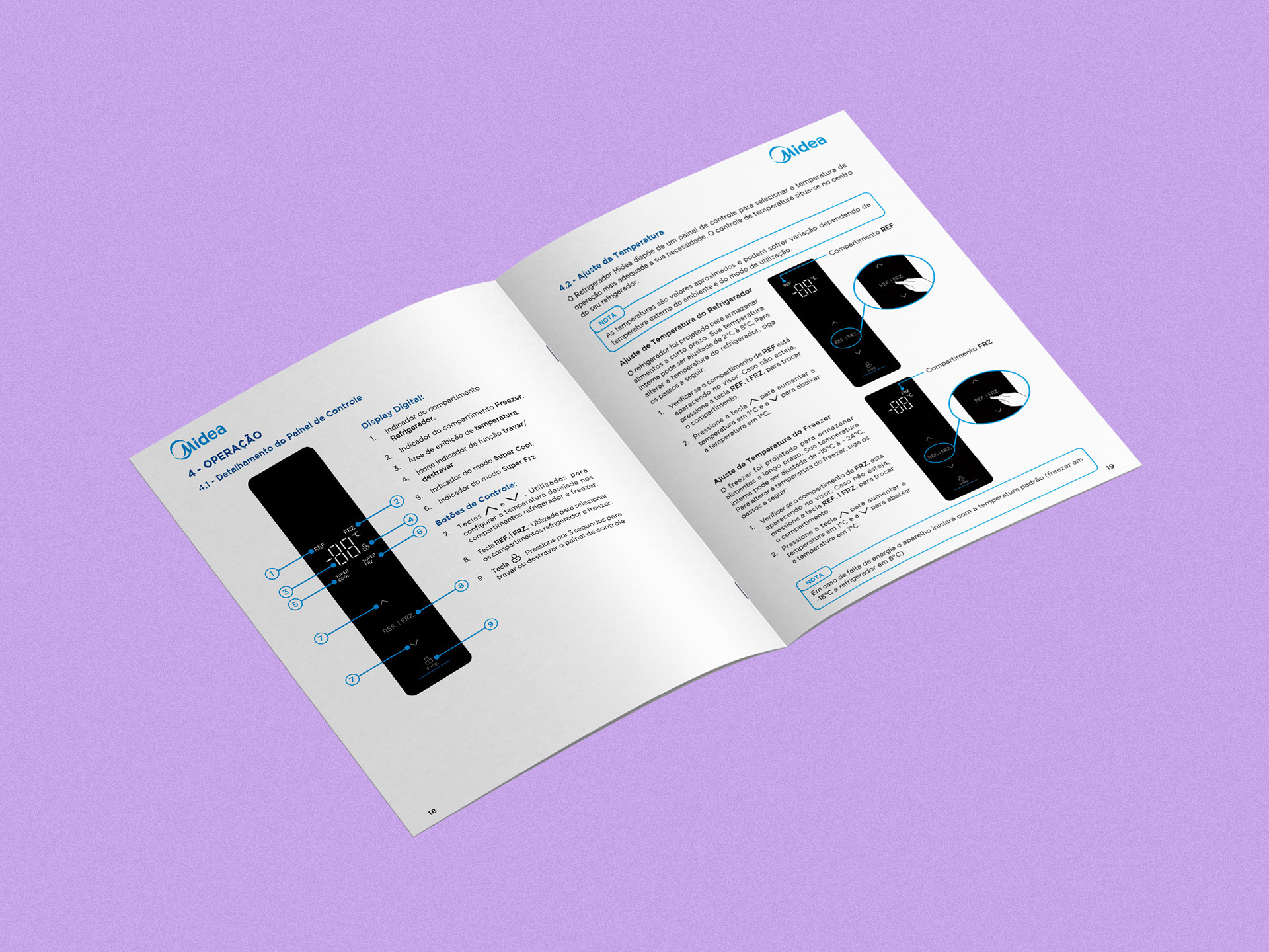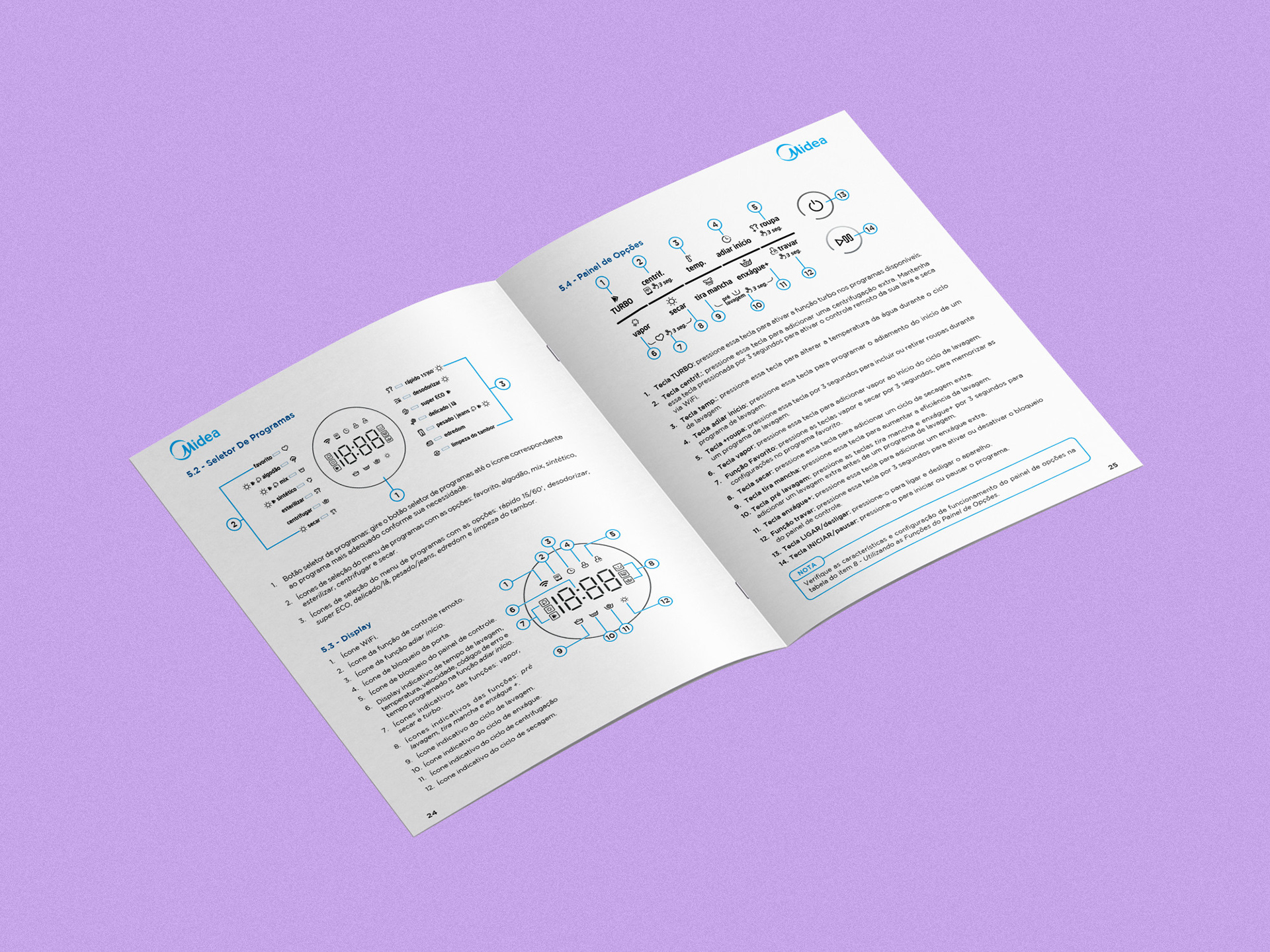 Diagramação para manual do usuário dos produtos Midea (2020-2025).